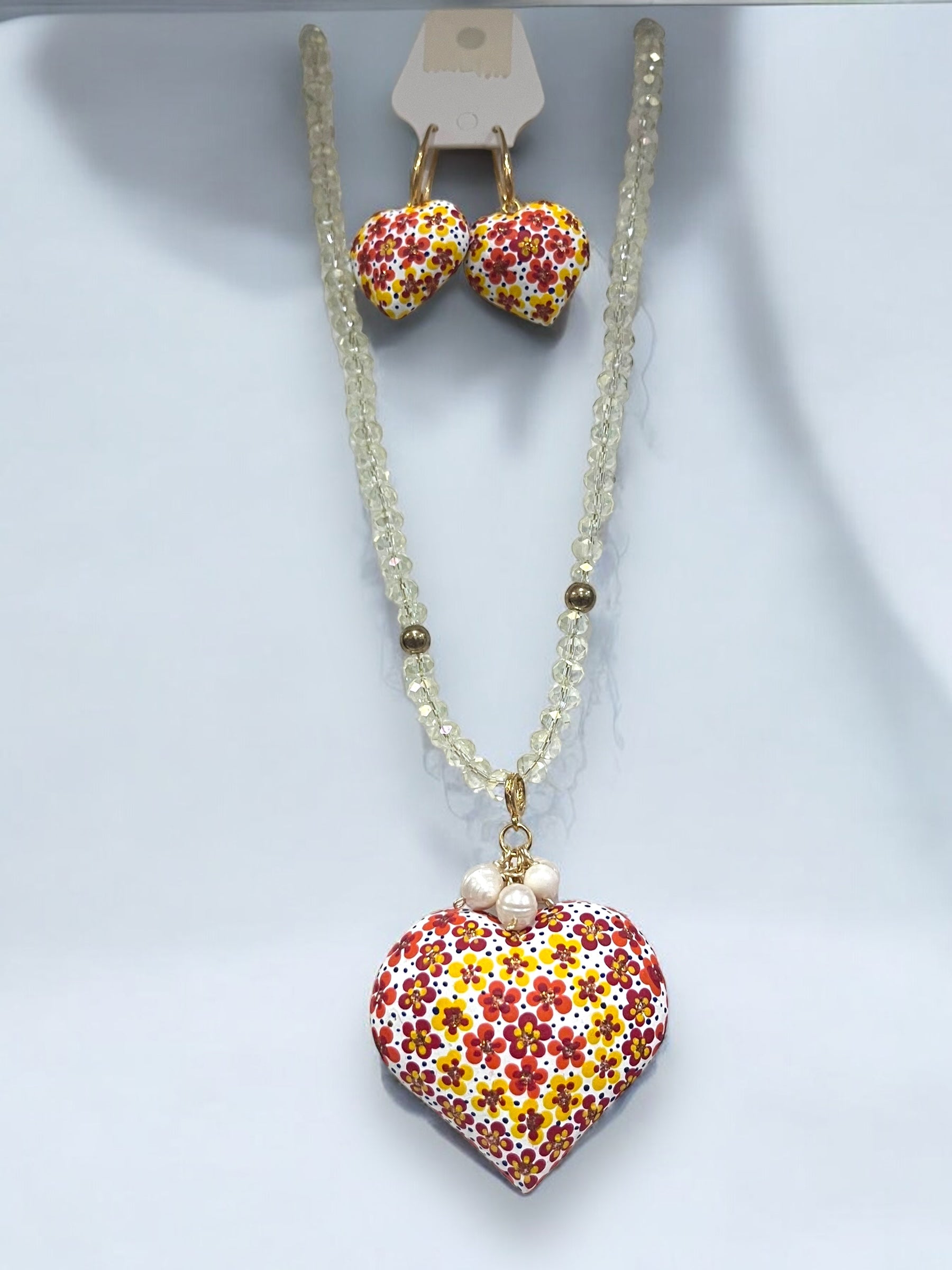 Conjunto de collar y aretes con dijes de corazón y flores multicolores