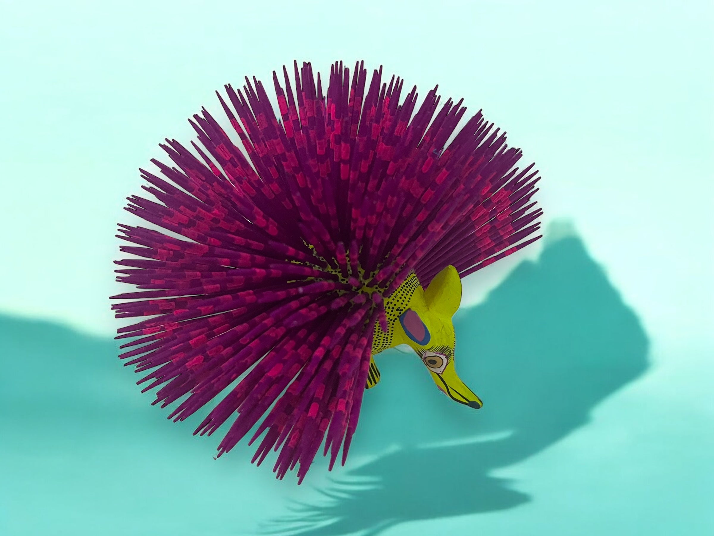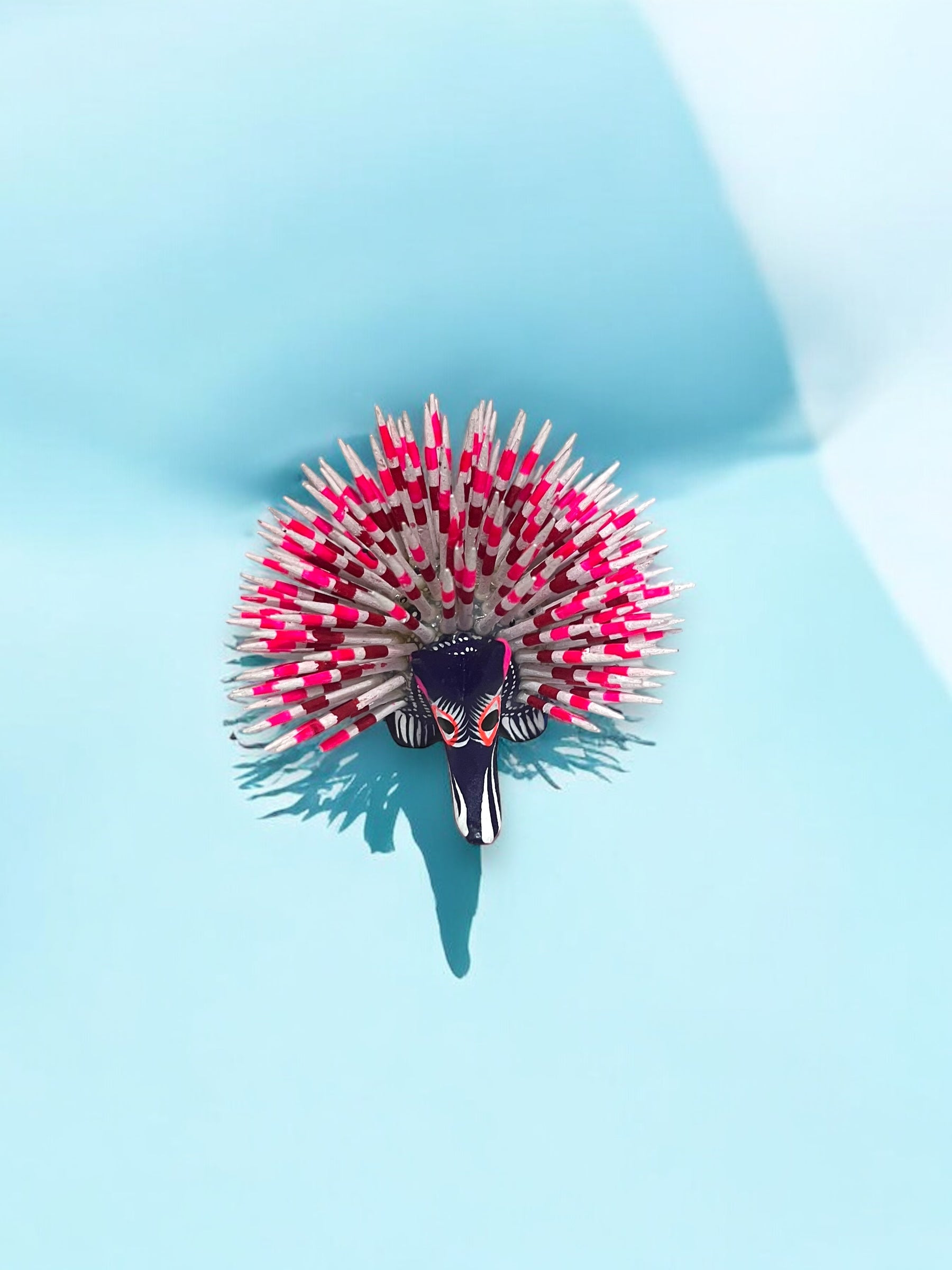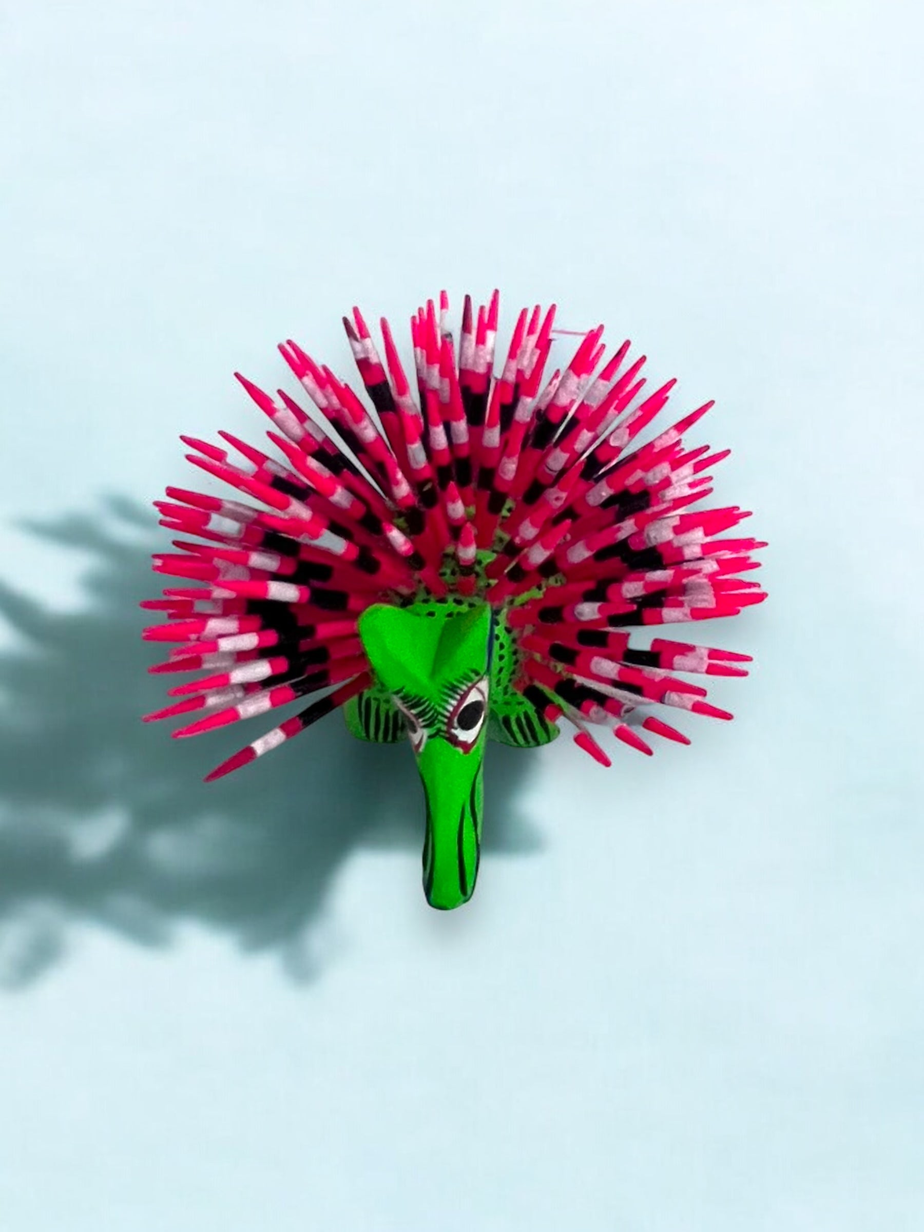 Figura artesanal de puercoespín verde con púas rosas y negras