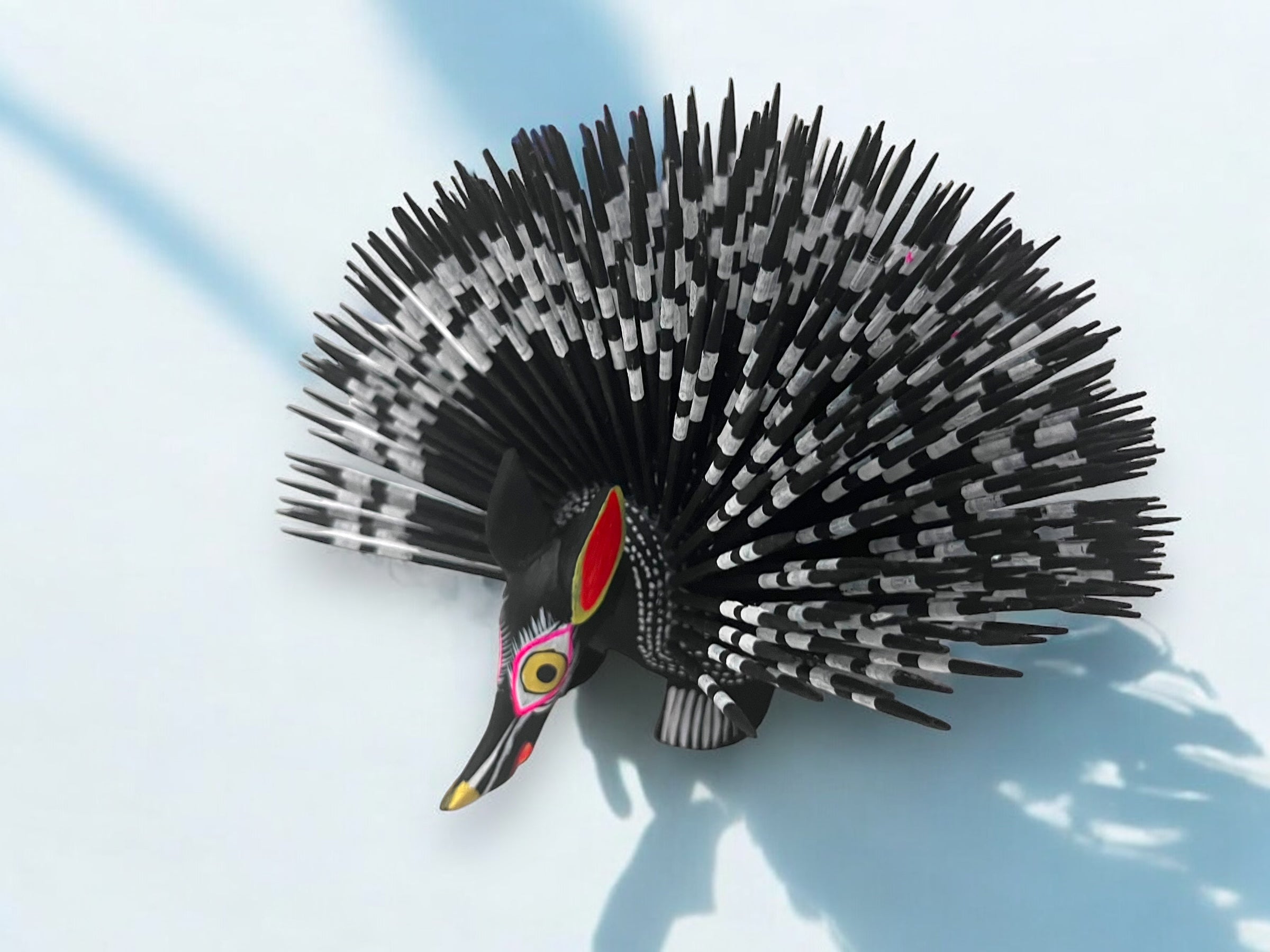 Figura artesanal de puercoespín con plumaje colorido