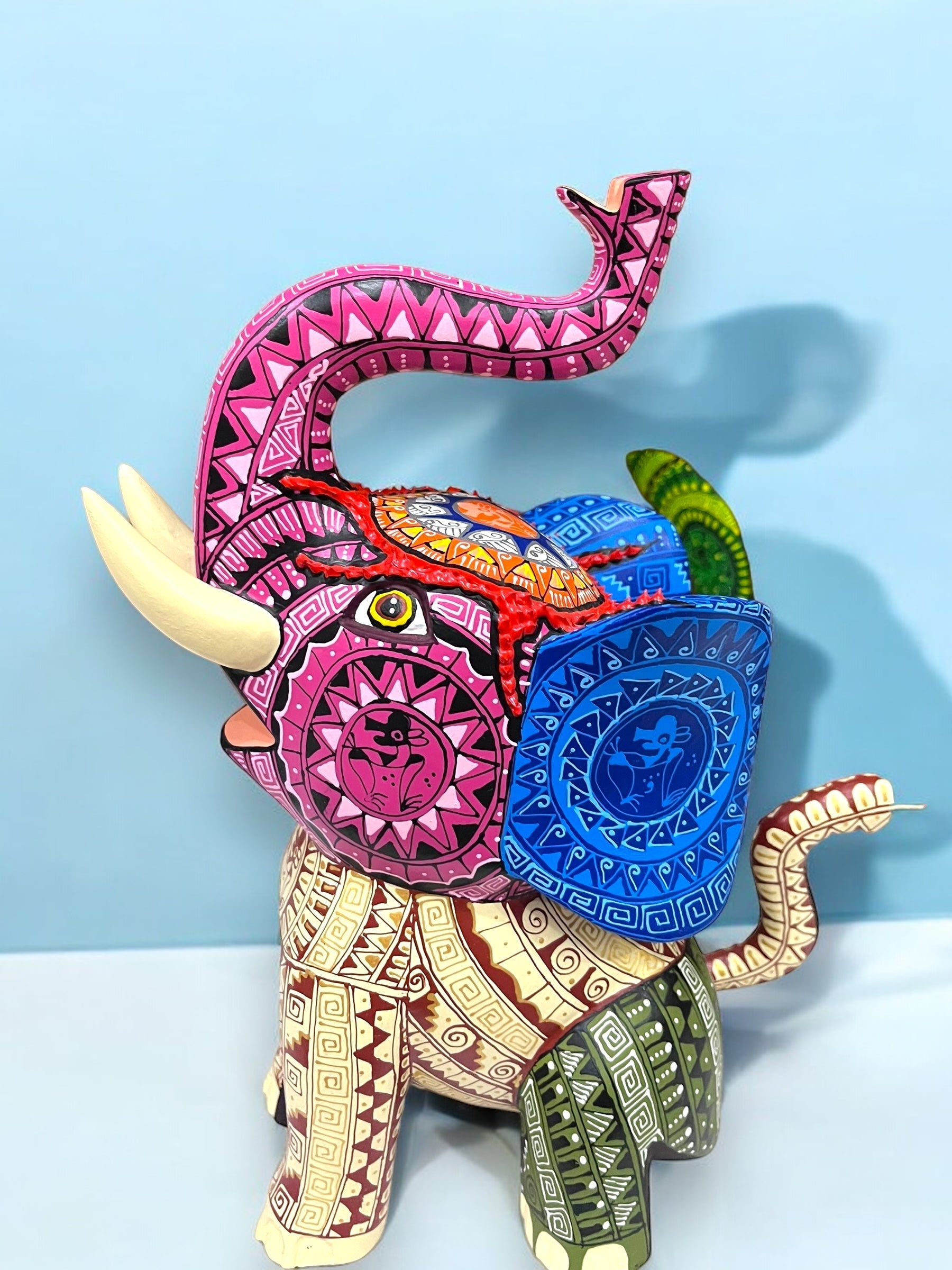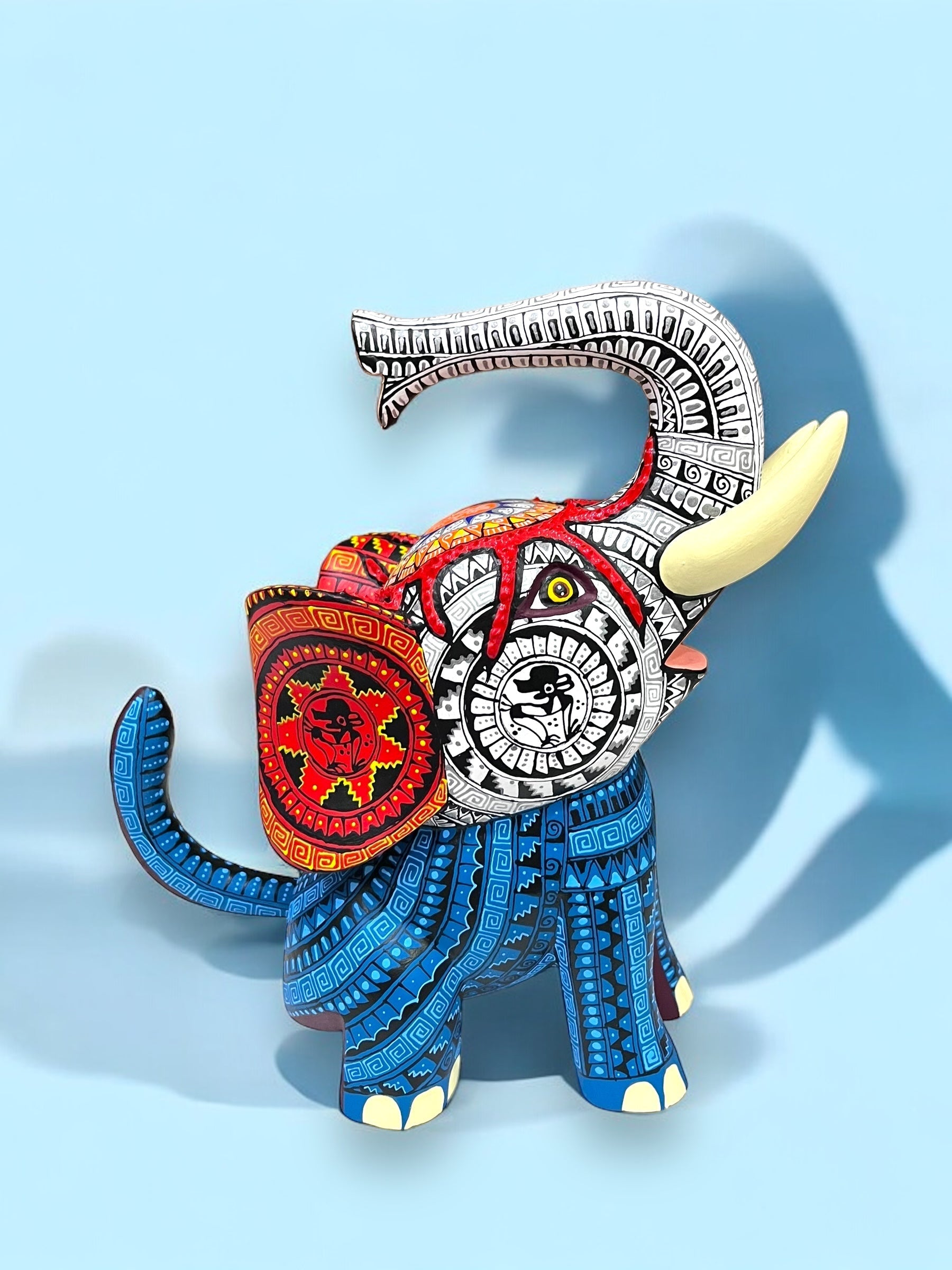Alebrije de elefante con detalles étnicos en azul y rojo