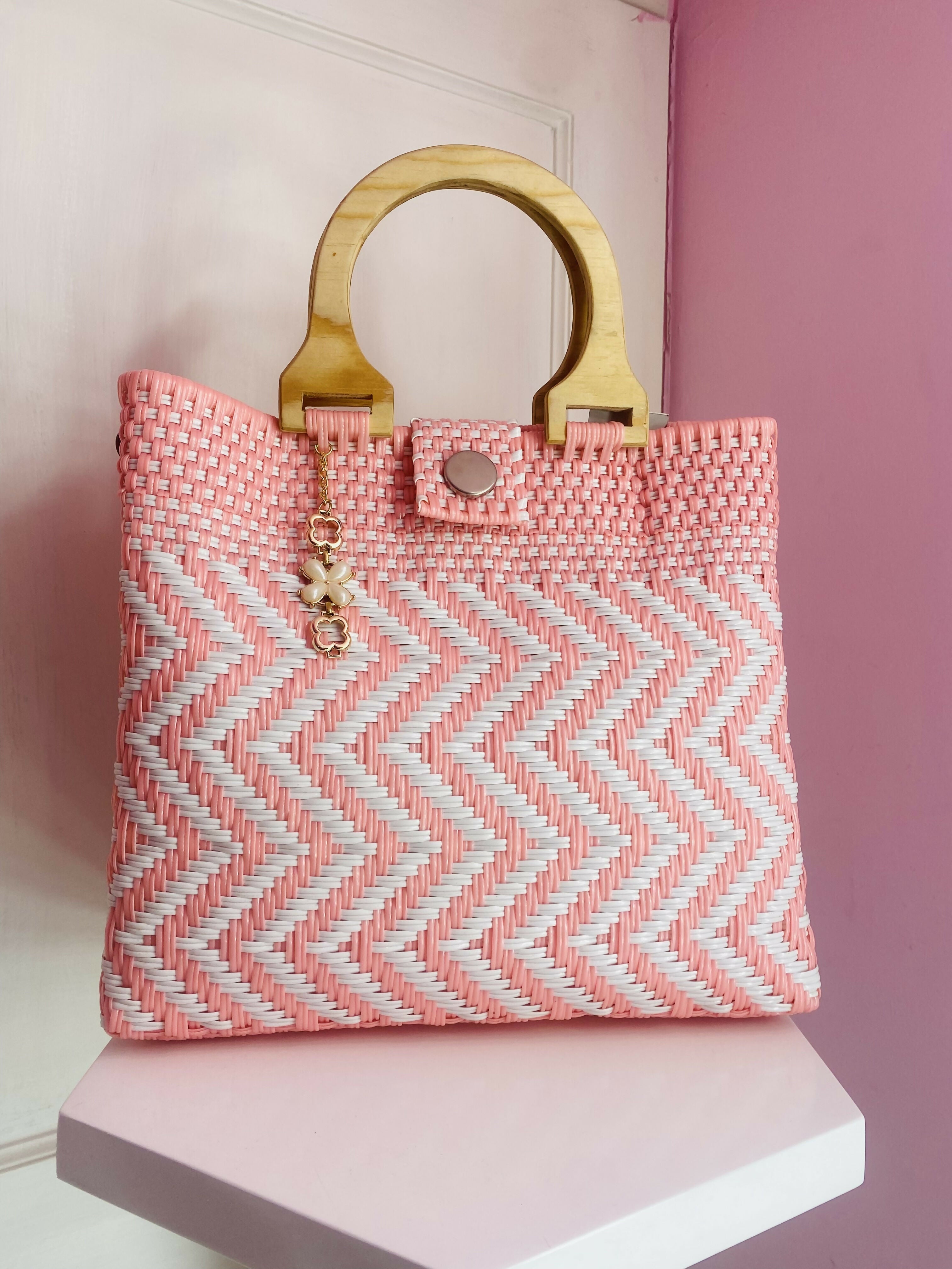 Bolsa artesanal grande con asa de madera (blanco con rosa)