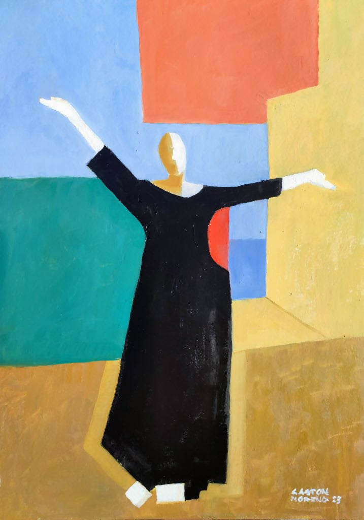 $ 8,500.00$ 8,500.00/Pintura al óleo sobre papel, 49.5x34.5 cms.Mujer Bailando con fondo geométrico.