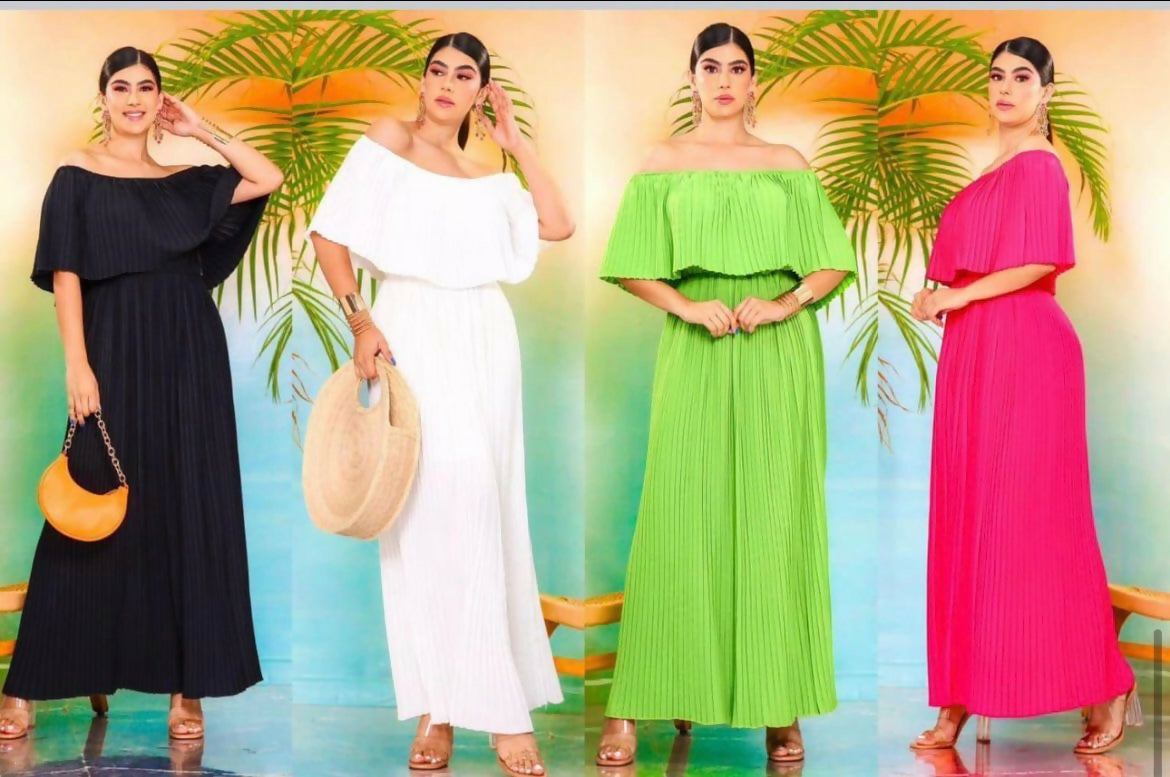 $ 499.00$ 499.00/Maxi vestido con holan plizado en los hombros y falda pliazada hasta los tobillos