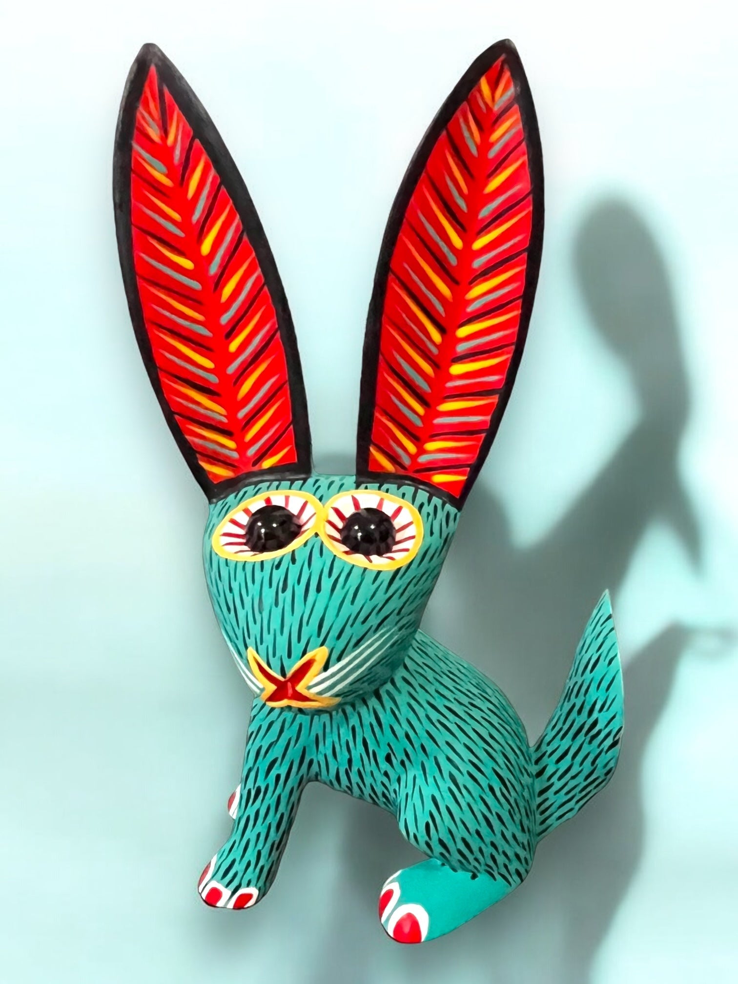 Alebrije de Conejo Verde con Orejas Largas Rojas