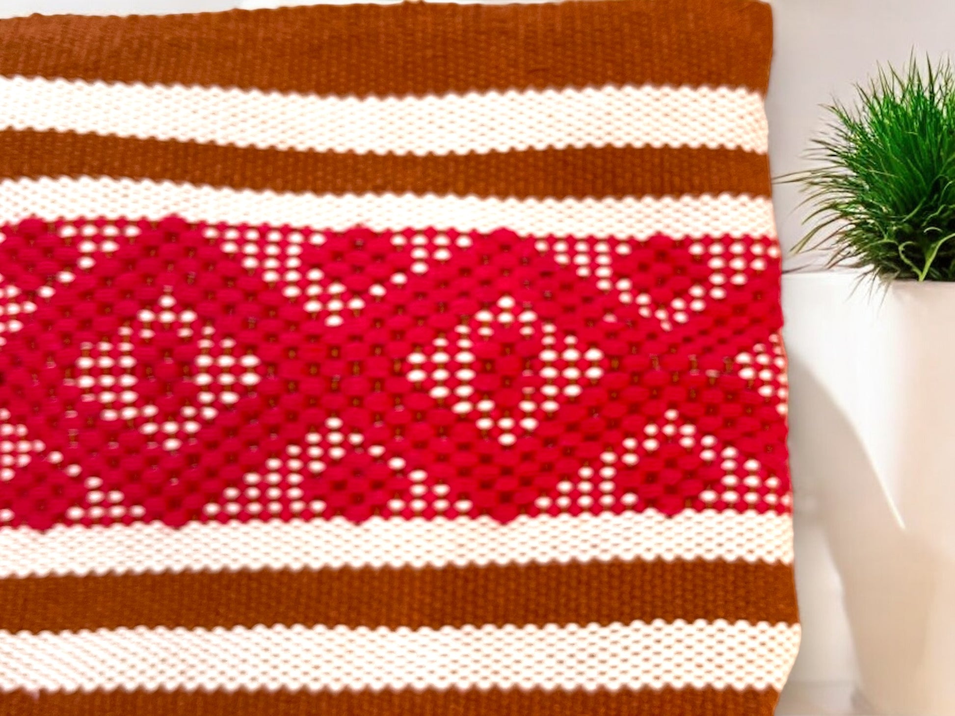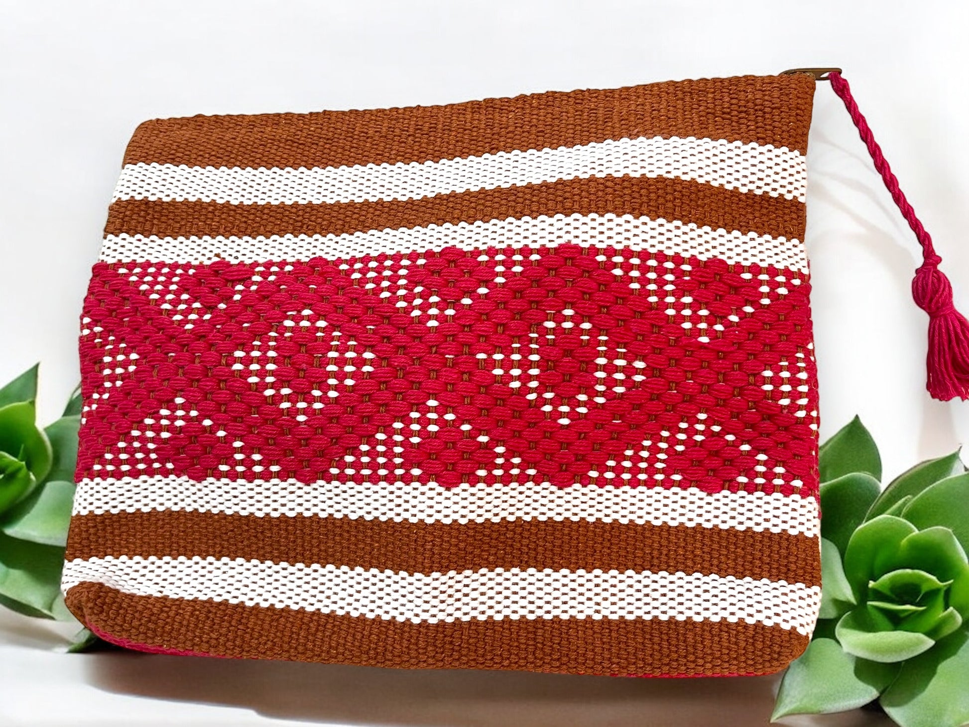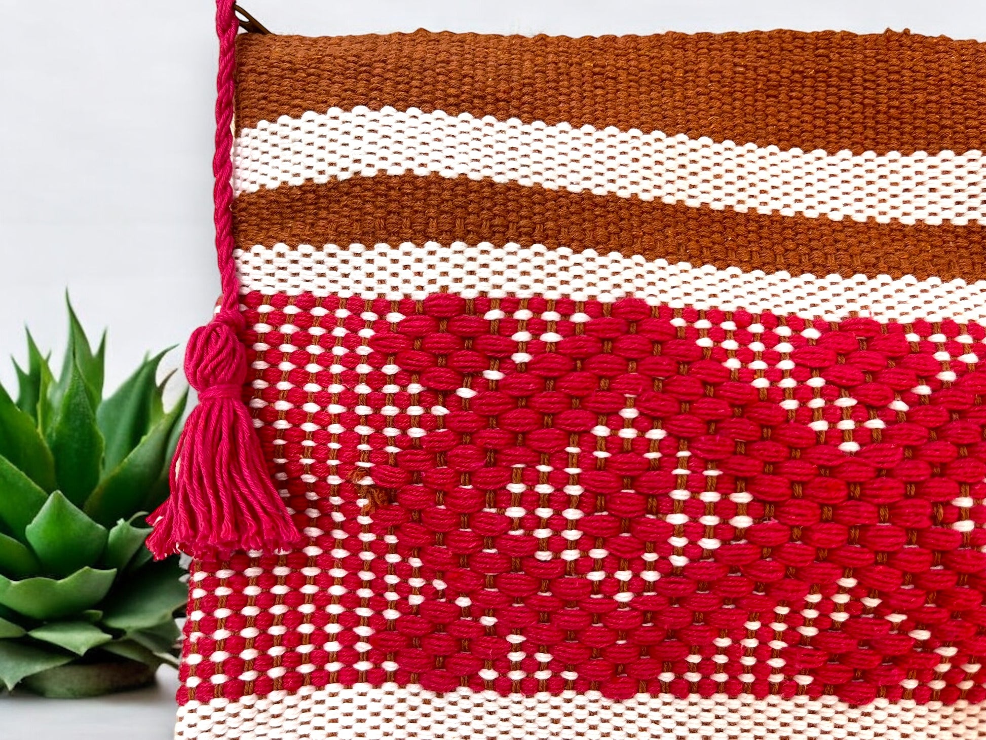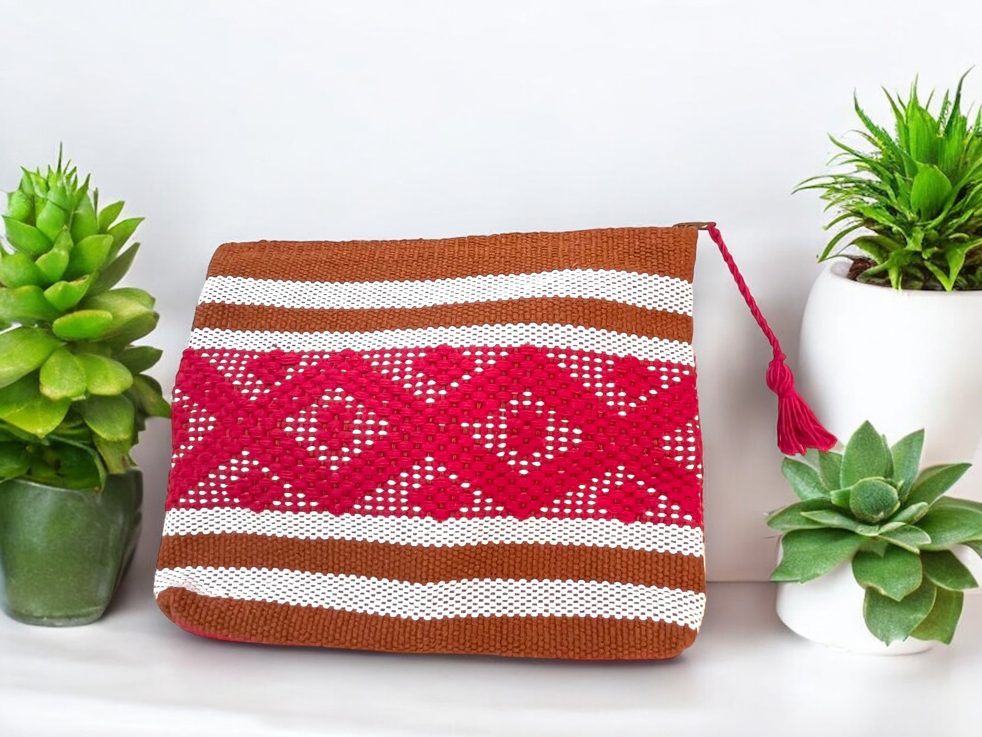 Bolso Tejido con Diseño Geométrico en Rojo y Marrón