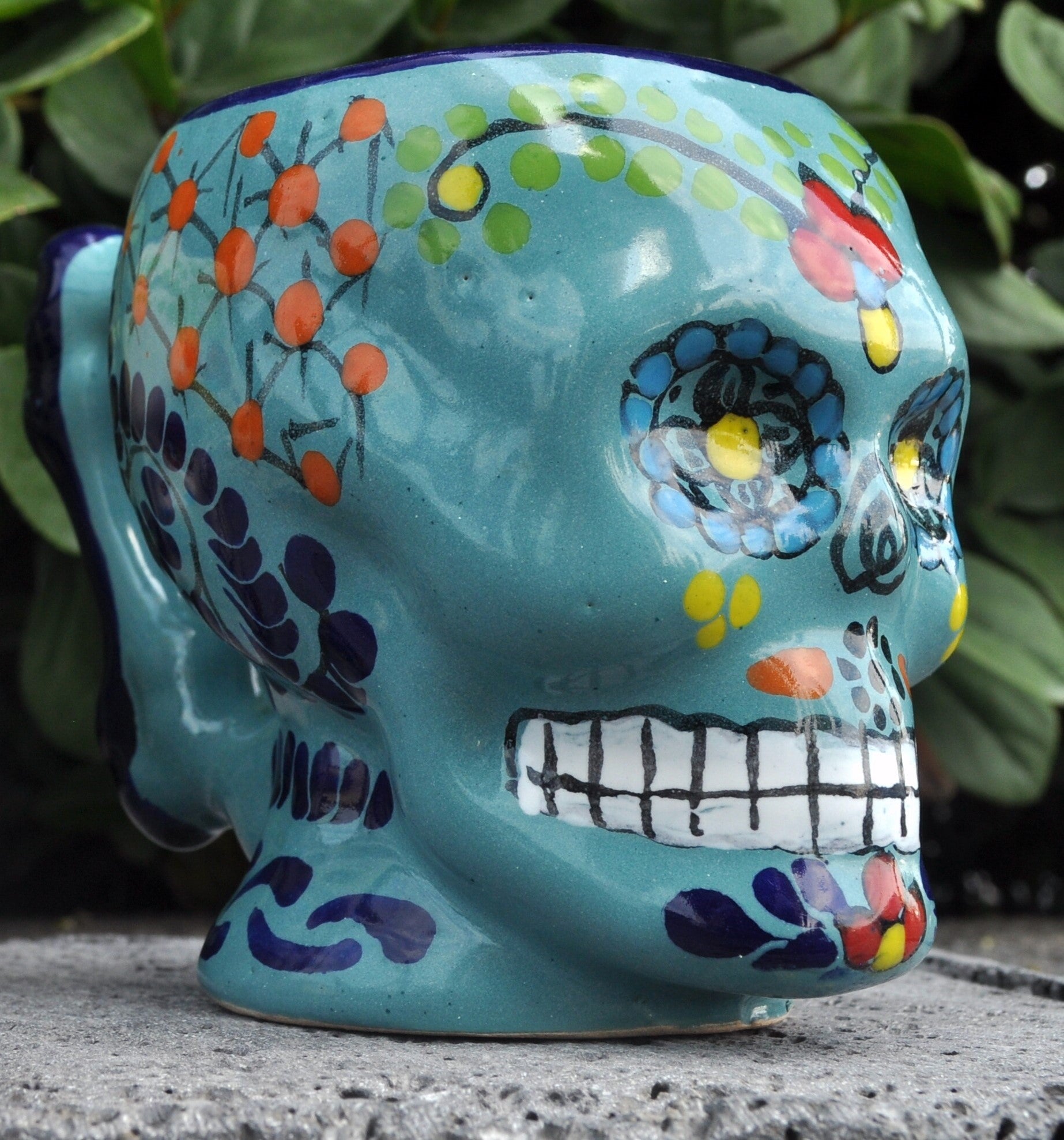 Tarro Taza de Talavera Poblana Mexicano con Diseño de Calavera Azul